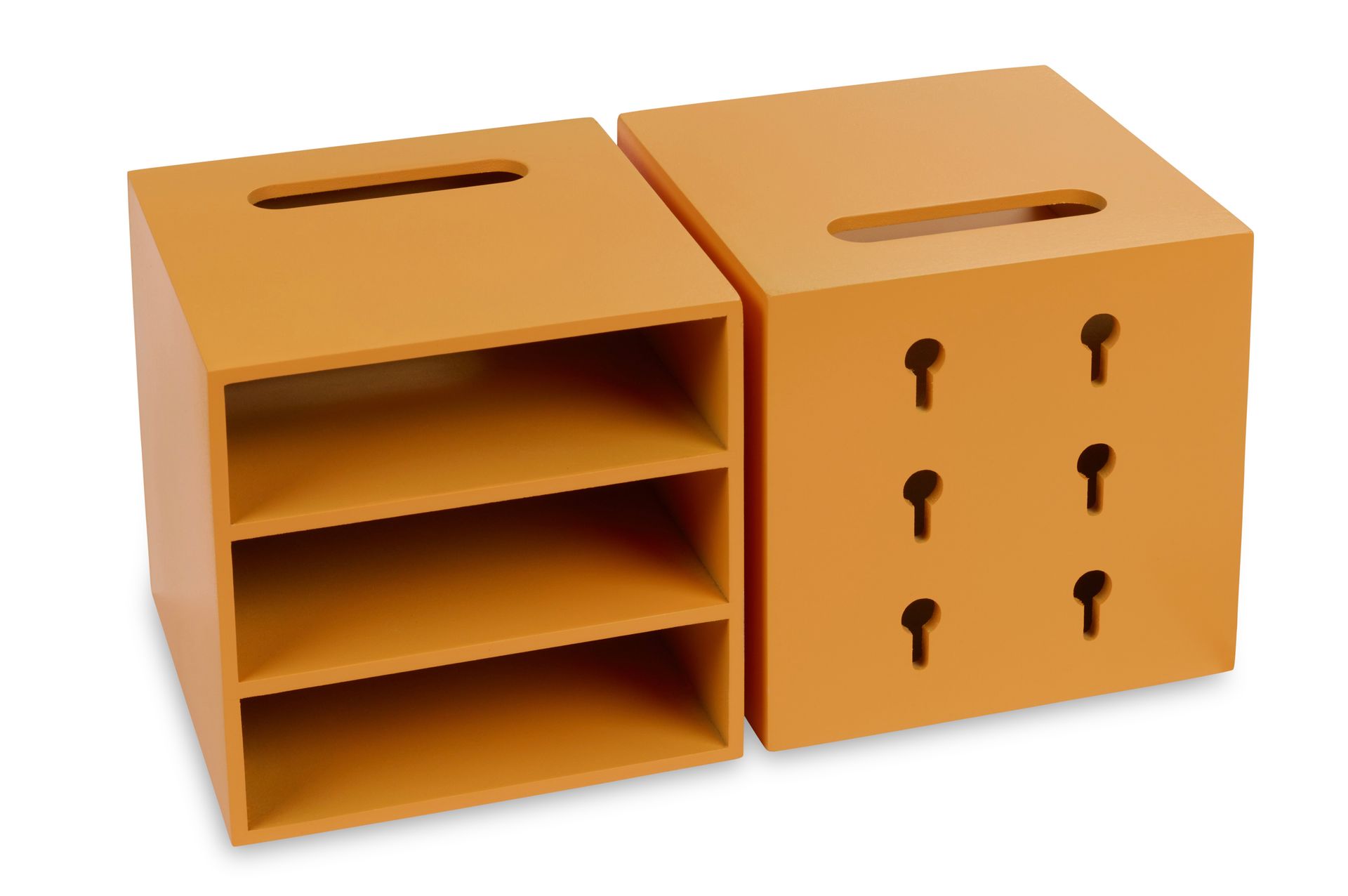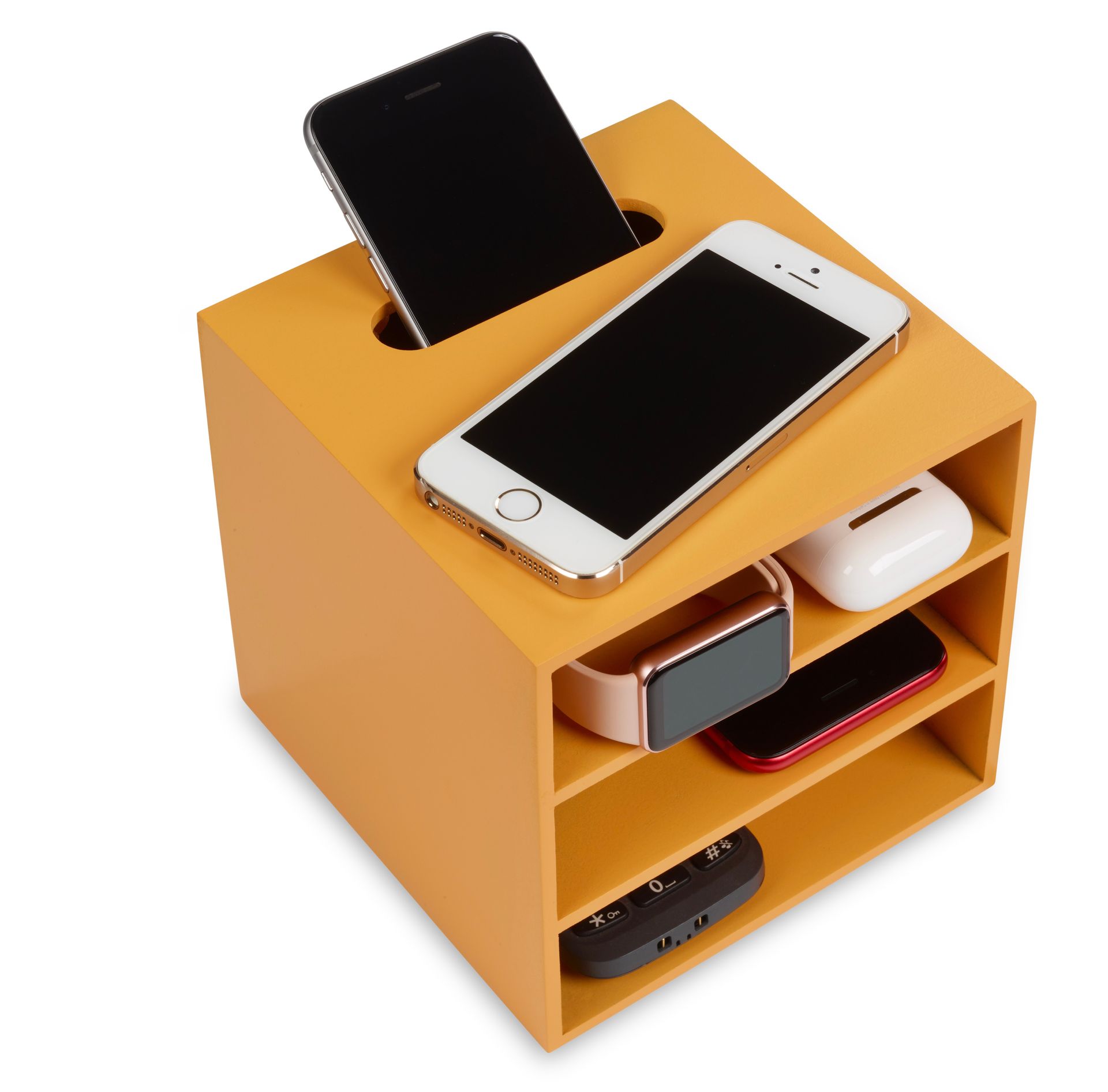 Diese Ablagebox ist nur 15 x 15 x 15 cm groß, hat aber Platz für mehrere Handys oder Smartphones, für iWatch, Fitnesstracker oder EarPods. In drei Fächern kann man mehrere Geräte an einem Ort ablegen und - durch die Kabelöffnungen und -führungen an der Rückseite - auch zum Aufladen ablegen. Sozusagen die Garage für Smarthones & Co. So muss man nicht immer suchen, wo die diversen Geräte gerade liegen. Ideal für Familien mit Kindern und mehreren Handys oder Zubehör. Außerdem sehen sie attraktiv aus und sind in fünf Farben erhältlich. Schöner Blickfang im Büro, Homeoffice oder zuhause.