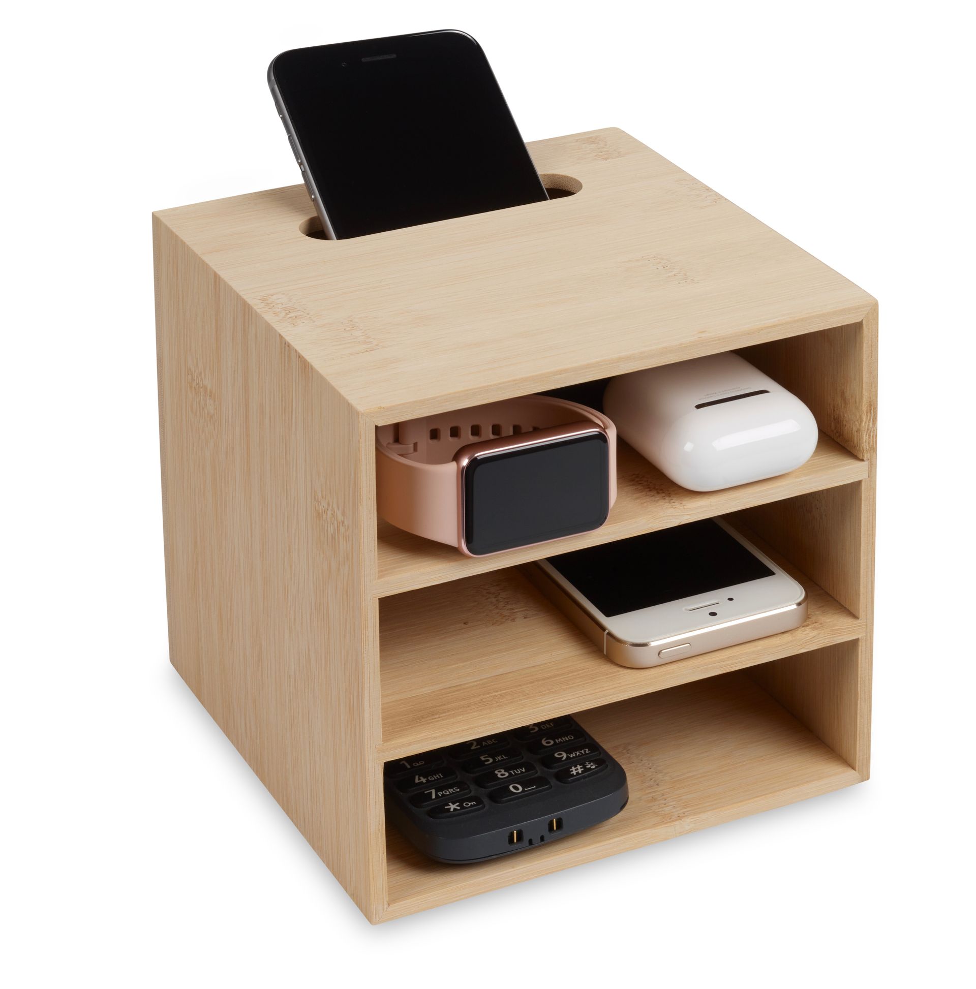 Diese Ablagebox ist nur 15 x 15 x 15 cm groß, hat aber Platz für mehrere Handys oder Smartphones, für iWatch, Fitnesstracker oder EarPods. In drei Fächern kann man mehrere Geräte an einem Ort ablegen und - durch die Kabelöffnungen und -führungen an der Rückseite - auch zum Aufladen ablegen. Sozusagen die Garage für Smarthones & Co. So muss man nicht immer suchen, wo die diversen Geräte gerade liegen. Ideal für Familien mit Kindern und mehreren Handys oder Zubehör. Außerdem sehen sie attraktiv aus und sind in fünf Farben erhältlich. Schöner Blickfang im Büro, Homeoffice oder zuhause.